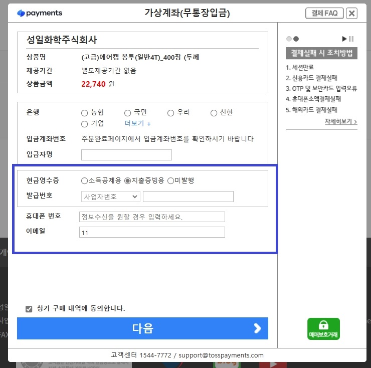 결제 과정 중 토스페이먼츠 창에서 현금 영수증 미발행 선택 후,