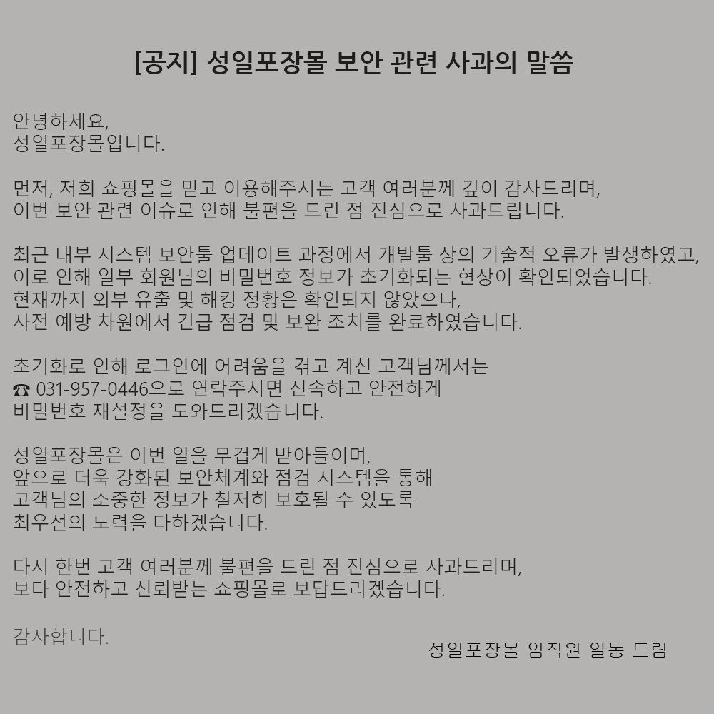 성일포장몰 로그인이슈 안내